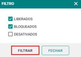 Passo 2: Selecione os filtros desejados, como clientes liberados, bloqueados ou desativados. Em seguida, clique no botão FILTRAR para gerar o relatório.