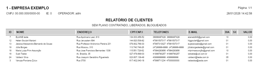 Passo 3: Visualize o relatório gerado, contendo a listagem dos clientes que não possuem plano contratado, conforme os filtros aplicados.