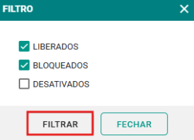 Passo 2: Selecione os filtros desejados, como clientes liberados, bloqueados ou desativados. Em seguida, clique no botão FILTRAR para gerar o relatório.