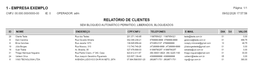 Passo 3: Visualize o relatório gerado, contendo a listagem dos clientes que não possuem o bloqueio automático configurado, conforme os filtros aplicados.