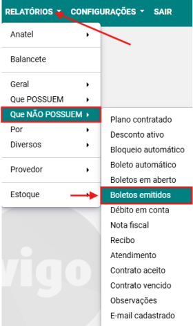 Passo 1: Acesse a opção RELATÓRIOS → QUE NÃO POSSUEM → BOLETOS EMITIDOS