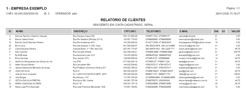Passo 3: Visualize o relatório gerado, contendo a listagem dos clientes que não possuem débito em conta, conforme os filtros aplicados.