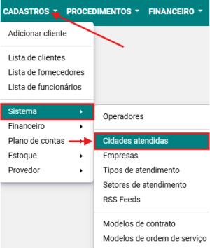 Passo 1: Selecionar a opção CADASTROS → SISTEMA → CIDADES ATENDIDAS