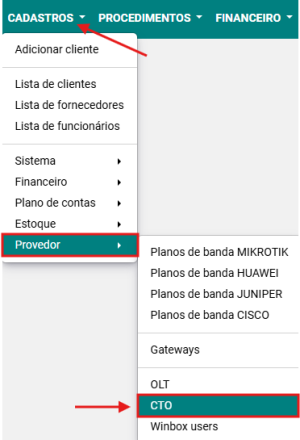 Passo 1: Selecionar a opção CADASTROS → PROVEDOR → CTO.