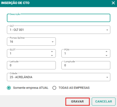 Passo 3: Preencha o formulário com as informações da CTO, como descrição, cidade, OLT, coordenadas geográficas, etc. Por fim, clique no botão GRAVAR para salvar as informações.