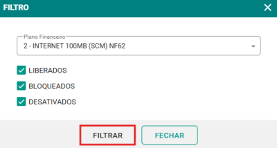 Passo 2: Selecione o Plano desejado e marque os filtros conforme a necessidade, como liberados, bloqueados ou desativados. Em seguida, clique no botão FILTRAR para gerar o relatório.
