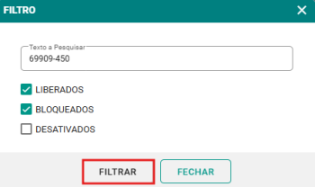 Passo 2: Informe o CEP desejado e marque os filtros conforme a necessidade, como liberados, bloqueados ou desativados. Em seguida, clique no botão FILTRAR para gerar o relatório.
