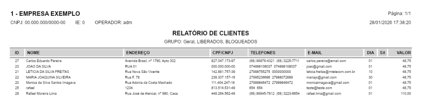 Passo 3: Visualize o relatório gerado, contendo a relação de clientes vinculados ao grupo informado, com informações como nome, endereço, CPF/CNPJ, telefones, e-mail e valores, conforme os filtros aplicados.