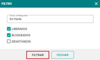 Passo 2: Informe a referência desejada e marque os filtros conforme a necessidade, como liberados, bloqueados ou desativados. Em seguida, clique no botão FILTRAR para gerar o relatório.