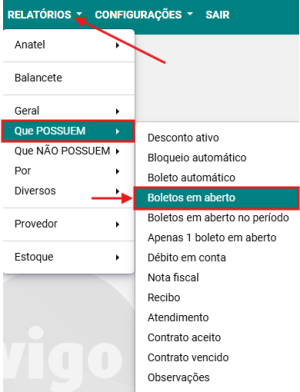 Passo 1: Acesse a opção RELATÓRIOS → QUE POSSUEM → BOLETOS EM ABERTO