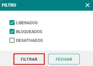 Passo 2: Selecione os filtros desejados, como clientes liberados, bloqueados ou desativados. Em seguida, clique no botão FILTRAR para gerar o relatório.