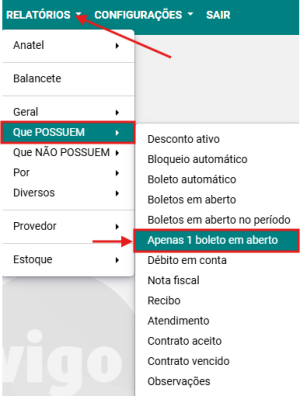 Passo 1: Acesse a opção RELATÓRIOS → QUE POSSUEM → APENAS 1 BOLETO EM ABERTO
