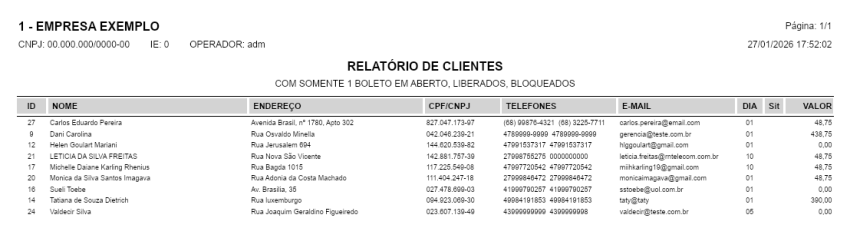 Passo 3: Visualize o relatório gerado, contendo a listagem dos clientes que possuem exatamente um boleto em aberto, conforme os filtros aplicados.