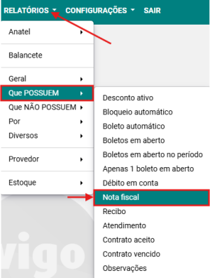 Passo 1: Acesse a opção RELATÓRIOS → QUE POSSUEM → NOTA FISCAL