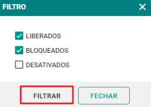 Passo 2: Selecione os filtros desejados, como clientes liberados, bloqueados ou desativados. Em seguida, clique no botão FILTRAR para gerar o relatório.