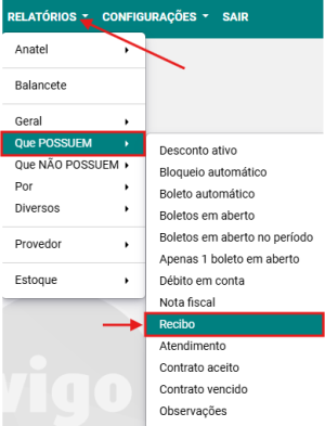 Passo 1: Acesse a opção RELATÓRIOS → QUE POSSUEM → RECIBO