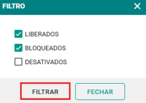 Passo 2: Selecione os filtros desejados, como clientes liberados, bloqueados ou desativados. Em seguida, clique no botão FILTRAR para gerar o relatório.