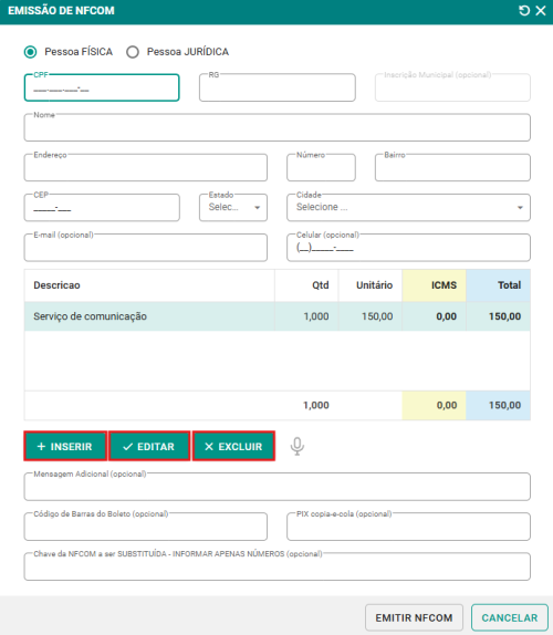 Passo 2: Selecione o tipo de pessoa (física ou jurídica), preencha os dados do cliente e clique em INSERIR para adicionar um item à nota, ALTERAR para editar um item existente ou EXCLUIR para remover o item selecionado.