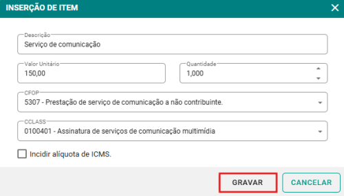 Passo 3: Informe a Descrição, Valor Unitário, Quantidade, selecione o CFOP e a CLASS, marque Incidir alíquota de ICMS se necessário e clique em GRAVAR. Após inserir os itens desejados, clique em EMITIR NFCOM para gerar a nota fiscal.