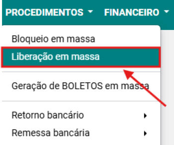 Passo 1: Selecionar a opção PROCEDIMENTOS → LIBERAÇÃO EM MASSA