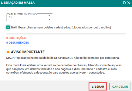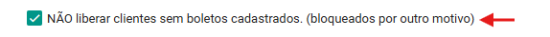 Atenção: Essa opção (se marcada) impede a liberação de clientes que não possuem boletos cadastrados, ou que estejam bloqueados por outro motivo, garantindo que apenas clientes com pendências financeiras válidas sejam liberados.