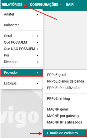 Passo 1: Acesse a opção RELATÓRIOS → PROVEDOR → E-MAILS DO CADASTRO