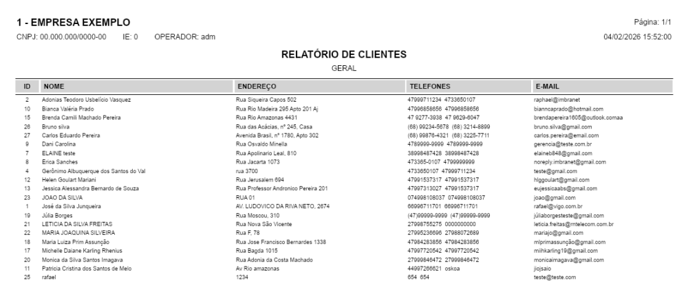 Passo 3: Visualize o relatório gerado, contendo a relação de e-mails cadastrados, com informações como nome do cliente, e-mail e demais dados do cadastro, conforme os filtros aplicados.