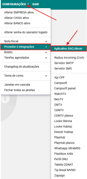 Passo 1: Acesse a opção CONFIGURAÇÕES → PROVEDOR E INTEGRAÇÕES → APLICATIVO SAC/AKRON