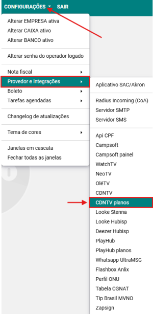 Passo 1: Acesse a opção CONFIGURAÇÕES → PROVEDOR E INTEGRAÇÕES → CDNTV PLANOS