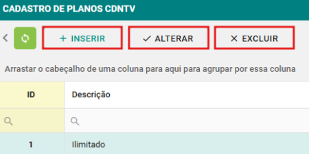 Passo 2: Clique no botão INSERIR para cadastrar um novo plano CDNTV, ALTERAR para editar um plano existente ou EXCLUIR para deletar o plano desejado.