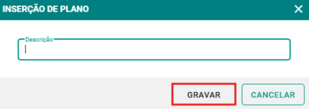 Passo 3: Na tela de inserção insira a descrição do plano. Logo após, clique no botão GRAVAR para concluir o cadastro.
