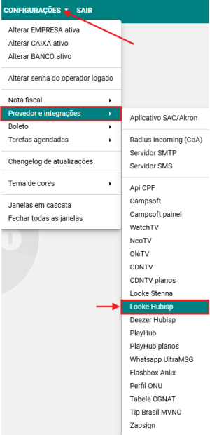 Passo 1: Acesse a opção CONFIGURAÇÕES → PROVEDOR E INTEGRAÇÕES → LOOKE HUBISP
