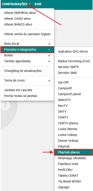 Passo 1: Acesse a opção CONFIGURAÇÕES → PROVEDOR E INTEGRAÇÕES → PLAYHUB PLANOS