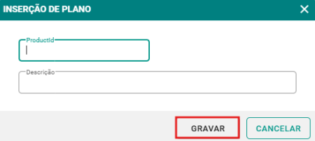 Passo 3: Na tela de inserção, informe a descrição e o ID do plano. Logo após, clique no botão GRAVAR para finalizar o cadastro.