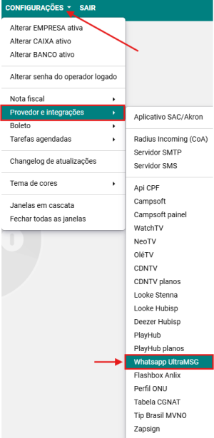Passo 1: Acesse a opção CONFIGURAÇÕES → PROVEDOR E INTEGRAÇÕES → WHATSAPP ULTRAMSG