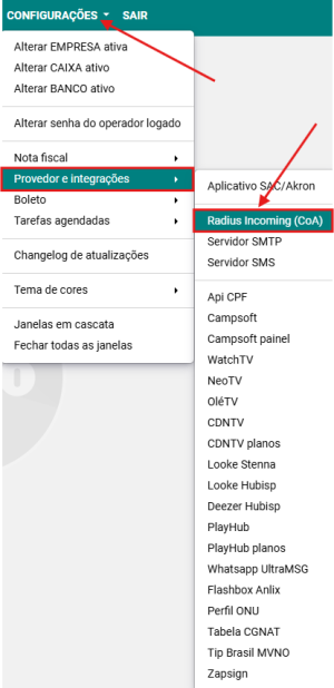 Passo 1: Acesse a opção CONFIGURAÇÕES → PROVEDOR E INTEGRAÇÕES → RADIUS INCOMING (CoA)