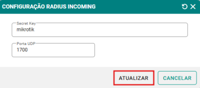 Passo 2: Informe a Secret Key e a Porta UDP conforme os dados configurados no equipamento ou servidor Radius que realizará a comunicação. Após conferir as informações, clique em ATUALIZAR para salvar as configurações.