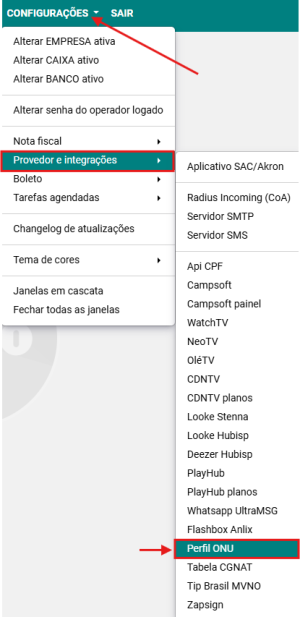 Passo 1: Acesse a opção CONFIGURAÇÕES → PROVEDOR E INTEGRAÇÕES → PERFIL ONU