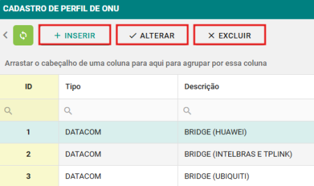 Passo 2: Clique no botão INSERIR para cadastrar um novo perfil de ONU, ALTERAR para editar um perfil existente ou EXCLUIR para remover o perfil desejado.