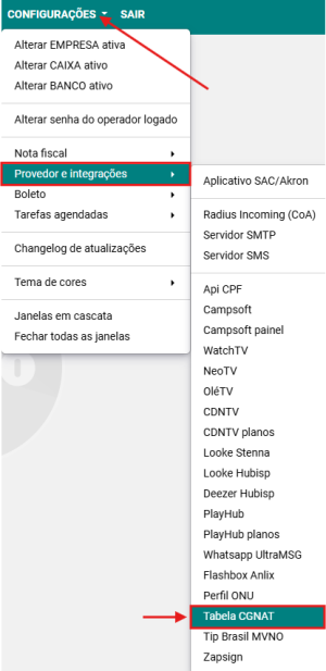 Passo 1: Acesse a opção CONFIGURAÇÕES → PROVEDOR E INTEGRAÇÕES → TABELA CGNAT