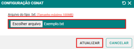 Passo 2: Clique no botão ESCOLHER ARQUIVO para selecionar um arquivo do tipo .txt (tamanho máximo de 100MB) contendo a tabela CGNAT. Logo após selecionar o arquivo, clique no botão ATUALIZAR para concluir a importação.