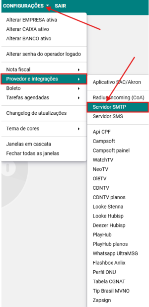 Passo 1: Acesse a opção CONFIGURAÇÕES → PROVEDOR E INTEGRAÇÕES → SERVIDOR SMTP