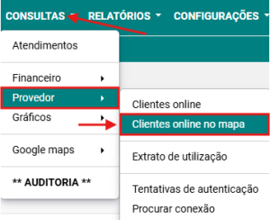 Passo 1: Acesse a opção CONSULTAS → PROVEDOR → CLIENTES ONLINE NO MAPA
