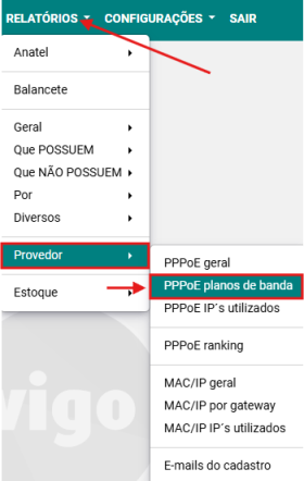 Passo 1: Acesse a opção RELATÓRIOS → PROVEDOR → PPPOE PLANOS DE BANDA