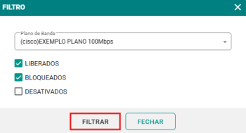 Passo 2: Selecione o Plano de Banda desejado e marque os filtros conforme a necessidade, como liberados, bloqueados ou desativados. Em seguida, clique no botão FILTRAR para gerar o relatório.