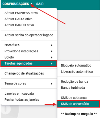 Passo 1: Selecione a opção CONFIGURAÇÕES → TAREFAS AGENDADAS → SMS DE ANIVERSÁRIO
